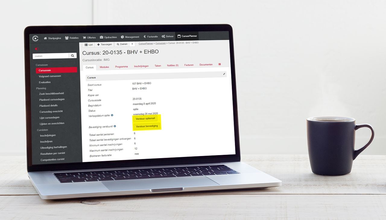 Bij IC cursussen met status ‘Optie’ is naast de bestaande ‘Optiemail versturen’ ook een knop voor het bevestigen van een cursus toegevoegd. Daarmee wordt een bevestigingsmail naar de klant gestuurd en eventueel wordt de status van de cursus dan ook op gepland gezet.